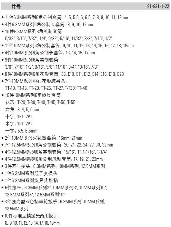 | 1A0057 | 91-931-1-22 | 即将上市,暂无货 套筒/旋具头/扳手等 | 套 | ¥1438.30元 | 15-60天 |