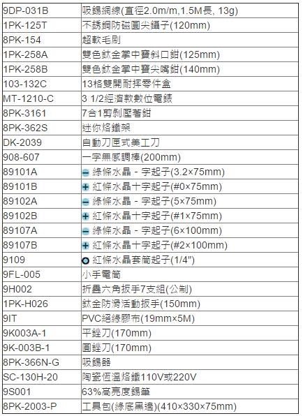 | 1A2907 | 1PK-2003B-1 | 包含:美工刀、万用表、螺丝刀等 | 套 | ¥1080.00元 | 7-15天 |