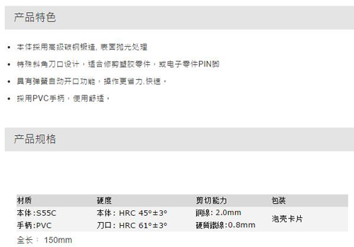 > 全部产品分类 > 五金工具 > 手动工具 > 电力/电子专用 > 电子钳 > 大斜角薄刀水口钳