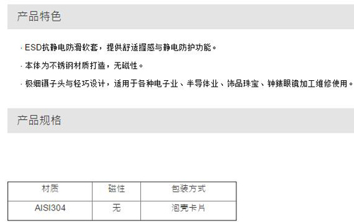 > 全部产品分类 > 五金工具 > 手动工具 > 电力/电子专用 > 防静电 > 防静电防滑软套圆尖镊子