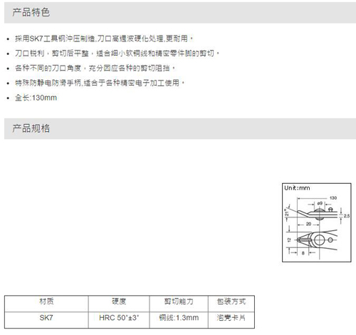 | 1A3513 | 1PK-101-E | 防静电,薄刃,斜口,长度:130MM | 把 | ¥48.10元 | 7-15天 |