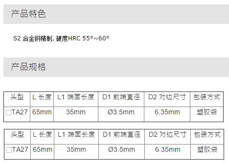 | 2A0433 | 9SD-0271S-TA27 | S2钢 1/4x65x3.5xTA27 | 把 | ¥2.60元 | 7-15天 |