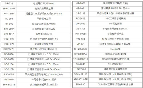 | 1A2932 | PK-4021M | 包含:螺丝刀、活动扳手、锤子等 | 套 | ¥3800.00元 | 7-15天 |