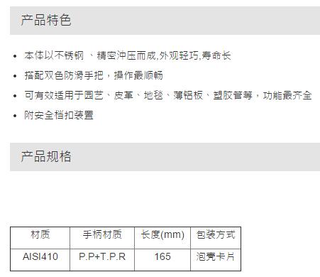 > 全部产品分类 > 五金工具 > 手动工具 > 锯/锉/剪/切 > 剪 > 双色不锈钢快利剪(蓝色)