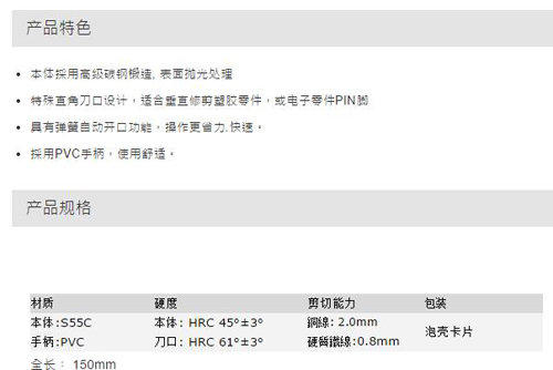 > 全部产品分类 > 五金工具 > 手动工具 > 电力/电子专用 > 电子钳 > 直角薄刀水口钳