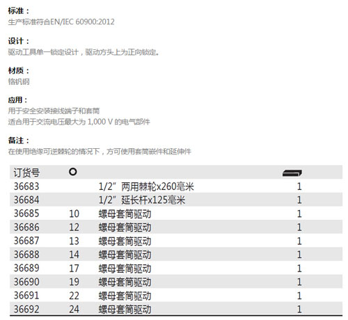 > 全部产品分类 > 五金工具 > 手动工具 > 电力/电子专用 > 绝缘工具 > 1/2英寸绝缘双向棘轮套筒扳手系列套装组件