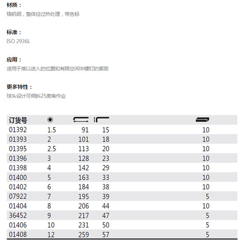 > 全部产品分类 > 五金工具 > 手动工具 > 螺丝刀/内六角 > 内六角 > L型球头内六角扳手 加长
