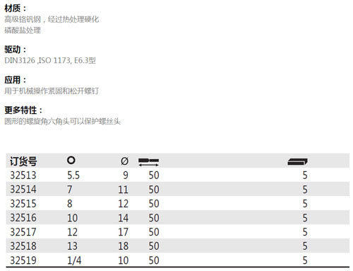 > 全部产品分类 > 五金工具 > 动力工具附件 > 批头 > 六角螺母套筒批头系列,E6.3