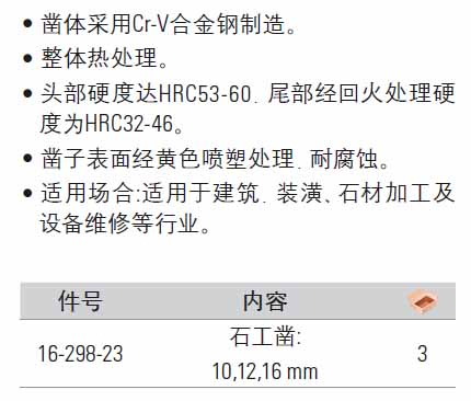 | 1A2461 | 16-298-23 | 石工凿:12,12,16mm,凿体材质:Cr-v合金钢 | 套 | ¥58.50元 | 1-3天 |
