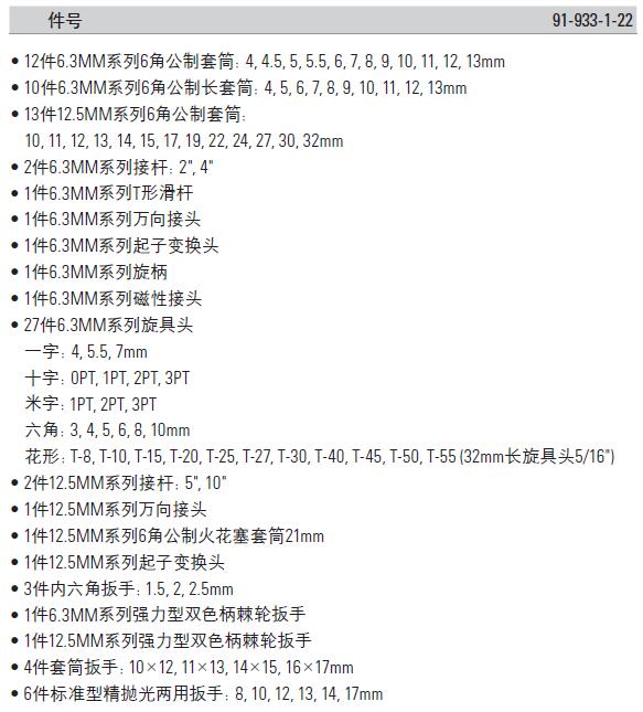 | 1A0055 | 91-933-1-22 | 即将上市,暂无货 套筒/接头/旋具头/扳手等 | 套 | ¥1340.70元 | 15-60天 |