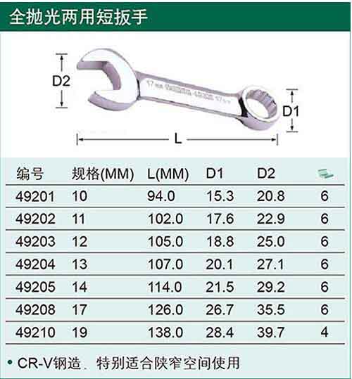 > 全部产品分类 > 五金工具 > 手动工具 > 扳手/套筒/扭矩扳手 > 其他扳手 > 公制全抛光短扳手