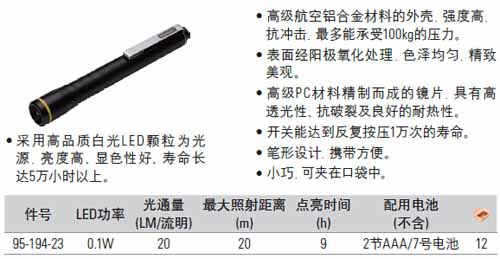 > 全部产品分类 > 五金工具 > 手动工具 > 更多通用工具 > 照明 > LED铝合金笔形手电筒