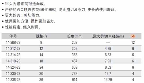 | 1A2374 | 14-314-23 | 14寸,长度:355mm,最大剪切直径:6.53mm,钳头材质:铬钼钢 | 把 | ¥145.00元 | 1-3天 | |