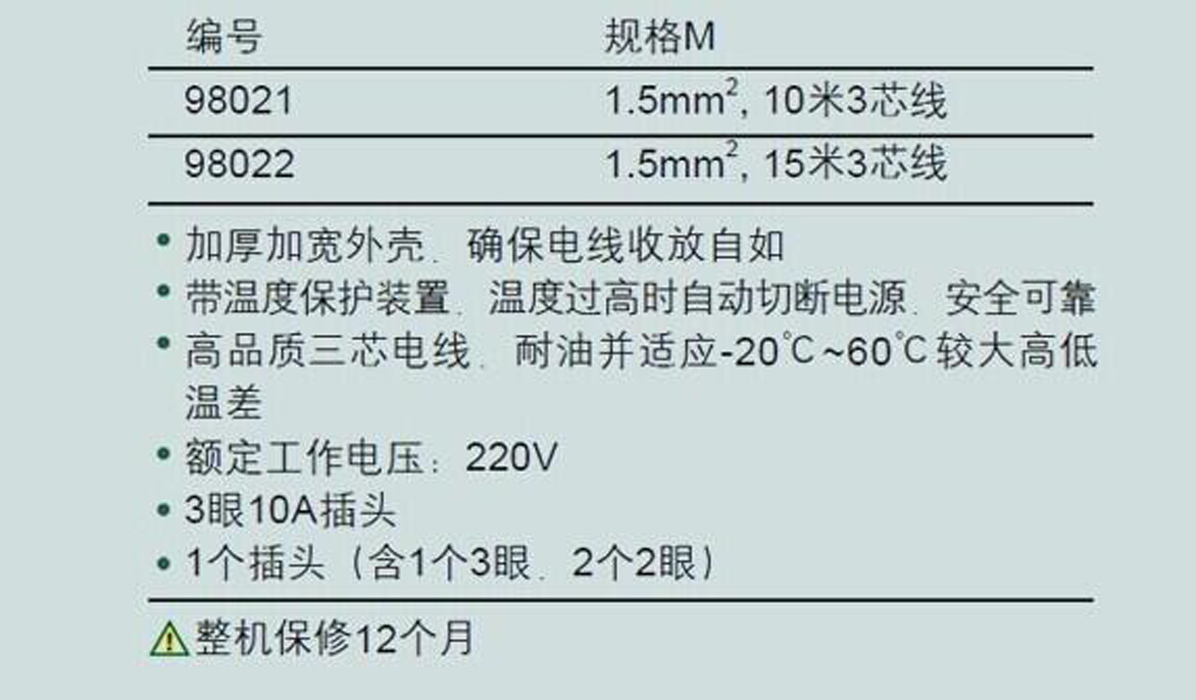 | 1A7328 | 98022 | 1.5平米,15米3芯线 | 只 | ¥799.00元 | 3-7天 |
