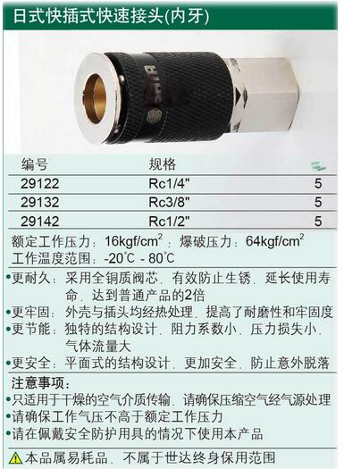 > 全部产品分类 > 五金工具 > 手动工具 > 扳手/套筒/扭矩扳手 > 扳手插头 > 日式快插式快速接头-内牙