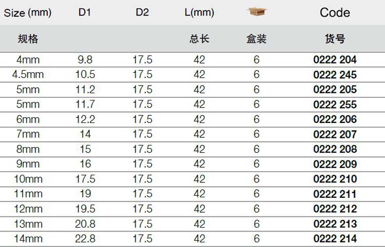 | 1A10603 | 0222214 | 规格:14mm | 支 | 询价 | 7-15天 |