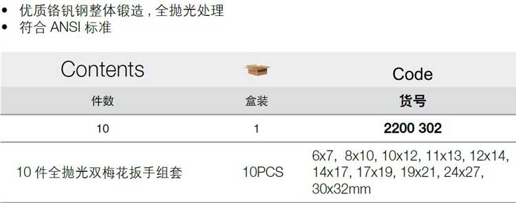 > 全部产品分类 > 五金工具 > 手动工具 > 扳手/套筒/扭矩扳手 > 组套扳手 > 10件全抛光双梅花扳手组套