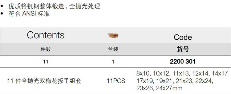 > 全部产品分类 > 五金工具 > 手动工具 > 扳手/套筒/扭矩扳手 > 组套扳手 > 11件全抛光双梅花扳手组套