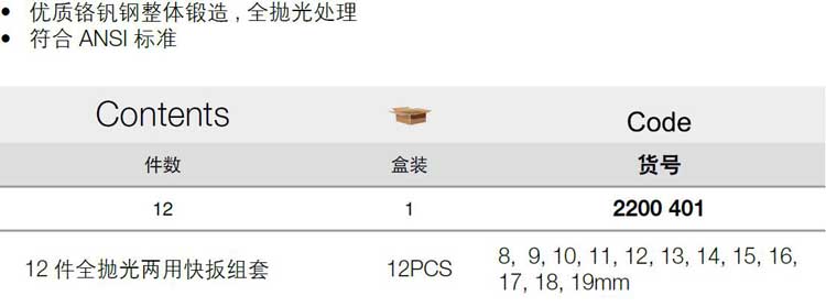 > 全部产品分类 > 五金工具 > 手动工具 > 扳手/套筒/扭矩扳手 > 组套扳手 > 12件全抛光两用快扳组套