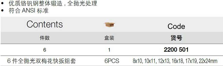 > 全部产品分类 > 五金工具 > 手动工具 > 扳手/套筒/扭矩扳手 > 组套扳手 > 6件全抛光双梅花快扳组套