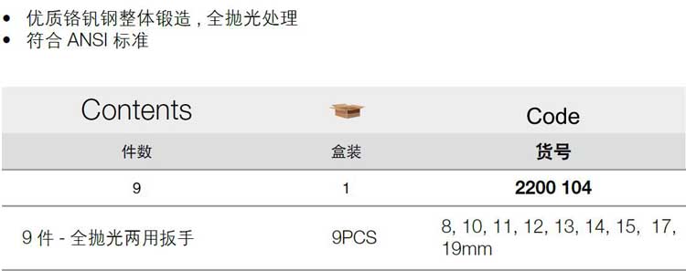 > 全部产品分类 > 五金工具 > 手动工具 > 扳手/套筒/扭矩扳手 > 组套扳手 > 9件全抛光两用扳手组套
