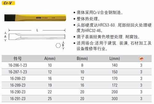 | 1A2465 | 16-288-23 | 总长:170mm,冲直径:16mm,柄直径:12mm,凿体材质:Cr-v合金钢 | 把 | ¥30.10元 | 1-3天 | |