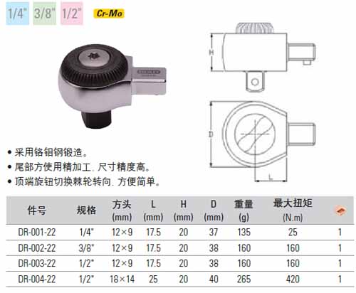 | 1A0519 | DR-004-22 | 1/2寸,方头:14x18mm | 把 | ¥261.60元 | 7-15天 |
